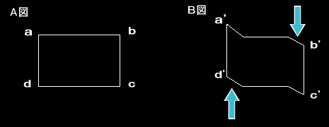 | 安倍の話のなかに、わたしの理解では「力の波及」とでもいうべきものがあるが、これは1ヶ所に力を加えると、その力は次々と他へ及んでゆく。安倍は「風船の1ヶ所を指で押すと、その力は風船全体に及ぶことを思い浮かべればよい」と説明する。 ヨーロッパ彫刻、たとえばミケランジェロの筋肉の動きが忠実に彫りだされている作品を思いうかべていただきたい。体の姿勢を少しでも動かせばそのために全身の筋肉に影響を及ぼしてしまう。これに対して日本の仏像、たとえば弥勒菩薩の造形手法では、上げた手と下げた手を左右逆にしても、他の部位に影響を及ぼすことはない。 この力の波及を図で説明すると、A図に⇒の力が加わるとB図のようにdはd´に移動し、それによってaはa´に移動する。そしてbはb´に、それによってcはc´に移動する。そして、ここでは図示していないがa´、c´に及んだ力をつぎつぎと波及させていくのである。